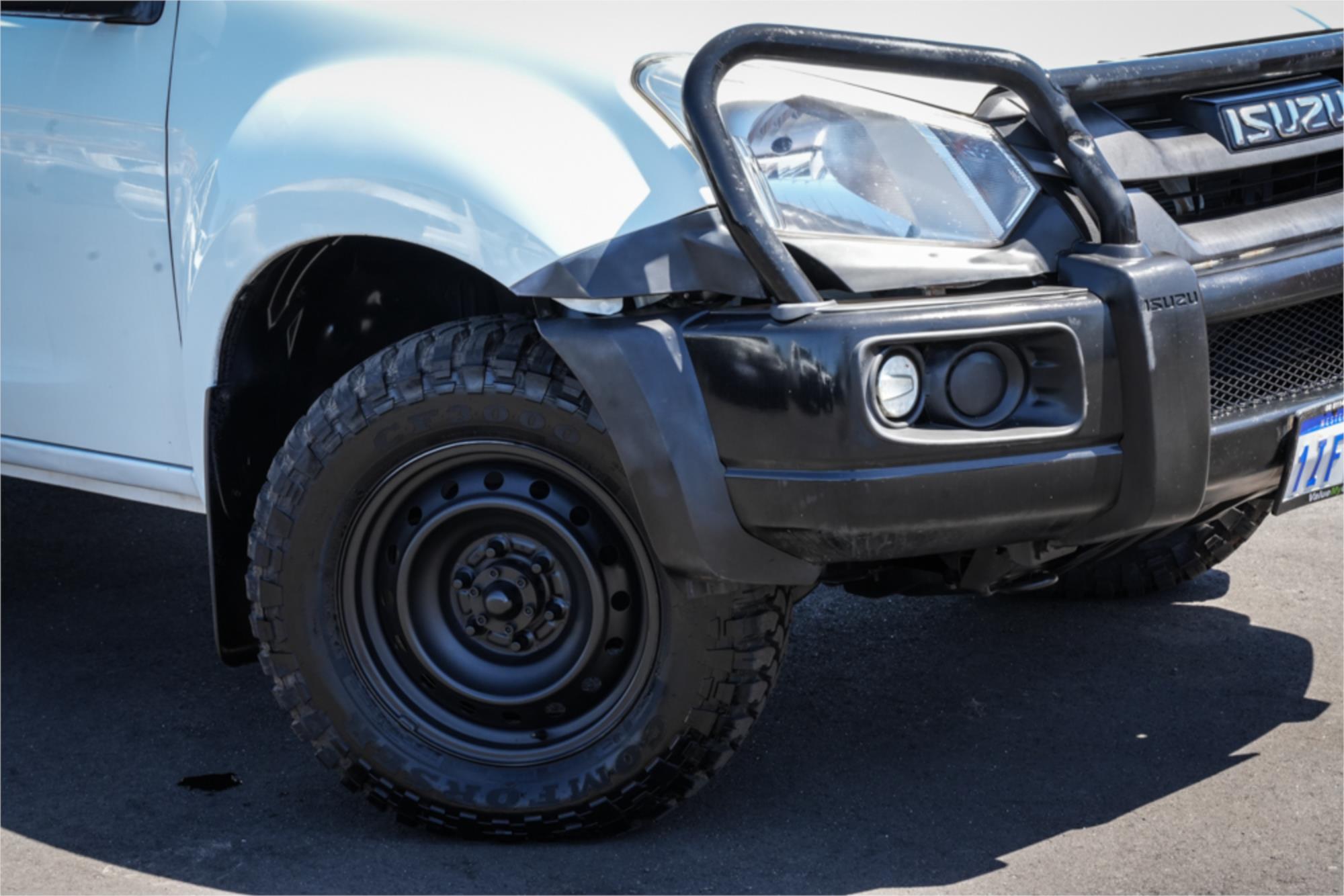 This example is fitted with a genuine Isuzu bullbar, steel tray and aggressive mud terrain tyres, giving it the rugged setup buyers look for in a serious work ute.